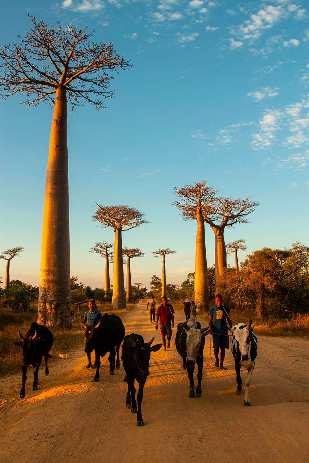 Située entre Morondava et Belon'i Tsiribihina, l'Allée des Baobabs est l'un des sites les plus emblématiques de Madagascar. Ces géants vieux de plus de 800 ans, surnommés 'Renala' (Mère de la forêt), bordent une piste de terre ocre, créant un paysage surréaliste unique au monde. Autrefois entourés d'une forêt tropicale dense, ces spécimens de Adansonia grandidieri sont aujourd'hui les derniers témoins d'un écosystème disparu. Leur silhouette massive et leurs branches ressemblant à des racines tendues vers le ciel en font une merveille botanique et un symbole de la résilience naturelle de l'île Rouge. Allée des Baobabs
